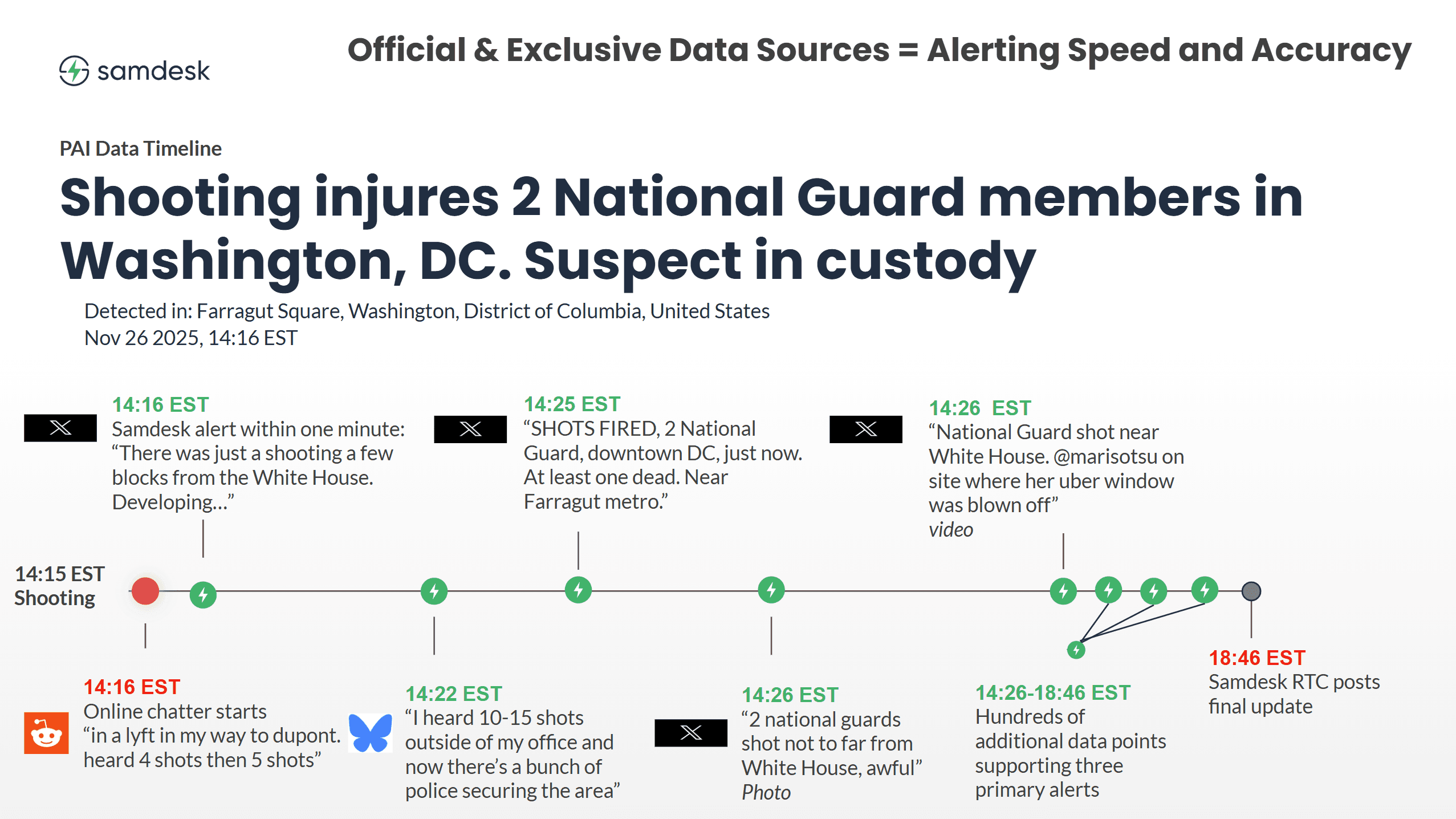 In one example, following a shooting near the White House involving National Guard members, early public reporting was chaotic and contradictory. Samdesk detected the first credible signals within one minute of the incident and continued to process and verify new information over the next four hours, refining the picture as details emerged and ultimately confirming the outcome: two guards injured, suspect in custody.